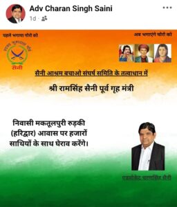 रुड़की। सैनी समाज की अनमोल और प्राचीन धरोहर सैनी आश्रम ज्वालापुर पर एकाधिकार और हड़पने की नीयत से रुड़की के एक बिल्डर और अपने नाते रिश्तेदारों करीबी जानकारों को शामिल कर फर्जी और कूट रचित दस्तावेजों के जरिए फर्जी संस्था को पंजीकृत कराने वाले मास्टर माइंड पूर्व राज्यमंत्री यूपी राम सिंह सैनी के खिलाफ समाज का आक्रोश बढ़ता ही जा रहा है विगत 3 अगस्त को ज्वालापुर में समाज की हुई बड़ी बैठक के बाद पिछले दिनों पूर्व राज्यमंत्री राम सिंह सैनी ने रुड़की में फर्जी संस्था के संरक्षक और आजीवन सदस्य बिल्डर केपी सैनी के होटल में पत्रकारों के समक्ष कोरा झूठ बोलते हुए फर्जी संस्था के मुख्य संरक्षक पद से इस्तीफा देने की बात की मगर इस्तीफा देने का कोई सबूत वे पेश नहीं कर सके इतना ही नहीं वे फर्जी संस्था पंजीकृत कराने से भी अपने आप को बचाते नजर आए लेकिन प्रेस वार्ता के बाद समाज के गणमान्य लोगों ने अपने सोशल मीडिया प्लेटफार्म पर लाइव आकर मंत्री जी द्वारा पत्रकारों के समक्ष बोले गए झूठ का पर्दाफाश कर दिया जिसमें उन्होंने बताया कि उपनिबंधक को फर्जी संस्था के पंजीकरण हेतु जो पत्र भेजा गया था उस पत्र में सबसे पहले पूर्व मंत्री राम सिंह सैनी के ही हस्ताक्षर है और दूसरे नंबर पर फर्जी संस्था के आजीवन सदस्य मनोज सैनी पूर्व प्रधानाचार्य तथा तीसरे नंबर पर परमवीर के हस्ताक्षर हैं अब मंत्री जी द्वारा लगातार समाज को गुमराह और भ्रमित करने को लेकर उनके मकतूलपुरी स्थित आवास को घेरने की तैयारी कर ली है सोशल मीडिया पर चल रहे पोस्टरों पर यदि विश्वास किया जाए तो एडवोकेट चरण सिंह सैनी किसान नेता संजीव चौधरी भागीरथ सेना के सुप्रीमो सोनू सैनी सुदर्शन आदि ने दावा किया कि वे फर्जी संस्था के निरस्तीकरण को लेकर अब सैनी समाज के हजारों लोगों के साथ पूर्व मंत्री रामसिंह सैनी के मकतूल पुरी आवास का घेराव करेंगे। उपरोक्त के अतिरिक्त कई अन्य समाज के लोगों ने भी मंत्री के आवास के घेराव की बात कही। बता दें कि पूर्व मंत्री राम सिंह सैनी के दिशा निर्देश और मार्गदर्शन में सैनी आश्रम, ज्वालापुर पर एकाधिकार और हड़पने की नीयत से रुड़की के एक बिल्डर और अपने रिश्तेदारों और करीबी जानकारों के साथ मिलकर जाली और कूट रचित दस्तावेजों के सहारे उपनिबंधक, फर्म्स, सोसाइटी एवं चिट्स के यहां प्रबंध समिति, सैनी आश्रम, ज्वालापुर नाम की फर्जी संस्था पंजीकृत करा ली थी, जिसकी भनक उन्होंने 30 जून तक समाज के किसी भी व्यक्ति को नहीं लगने दी। कहते है कि चोरी ज्यादा दिनों तक छुपी नहीं रह सकती और वहीं हुआ 30 जून को जब समाज को सैनी आश्रम के नाम पर पंजीकृत कराई फर्जी संस्था की जानकारी लगी तो समाज के युवाओं, गणमान्य नागरिकों में पूर्व मंत्री राम सिंह सैनी
